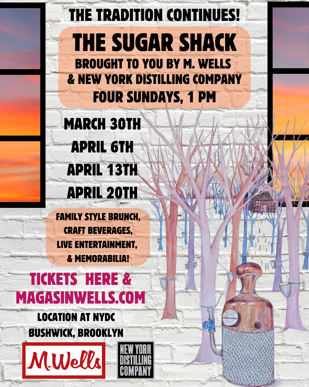 Sugar Shack in the City returns with co-hosts M. Wells and New York Distilling Company inviting you to NYDC’s gorgeous event space in Bushwick, Brooklyn and a relaxed rendezvous celebrating the maple syrup sapping season with a festive one-of-a-kind and over-the-top brunch and awesome live music. The Sunday brunch series runs in the Spring for four weeks.