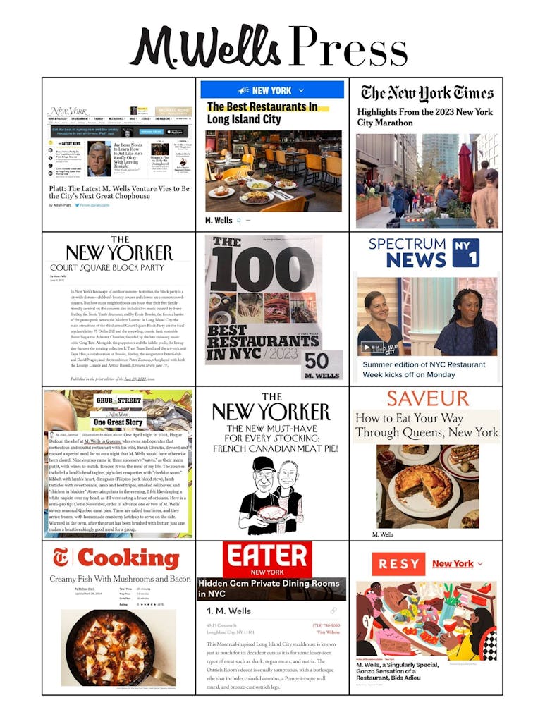 Press coverage for M. Wells, Hugue Dufour and Sarah Obraitis has appeared in Bon Appétit, CBC, The Commercial Observer, The New Yorker, Eater, Elle Décor, EnRoute, Financial Times, Forbes, Food & Wine, Found, The Gannet, Infatuation, Lonely Planet, Michelin Guide, Monocle, NY Observer, New York Magazine, Newsday, Oh My Rockness, Saveur, Thrillist, Time Out, Travel + Leisure, Travel News, Vogue and Zagat’s.